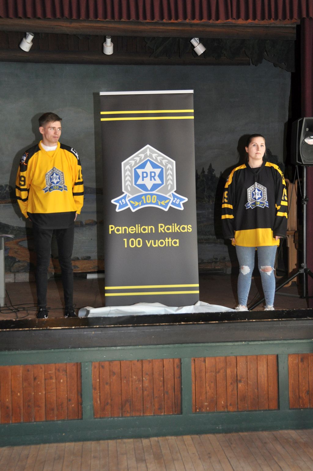 Panelian Raikas juhlii tasavuosia muun muassa kelta-mustilla retropaidoilla. Viime toukokuussa juhlahumun aloitustapahtumassa paitoja esittelivät PaRan edustusjoukkueissa pelaavat sisarukset Jonne ja Katju Koivumäki. Arkistokuva: Esa Viippola.